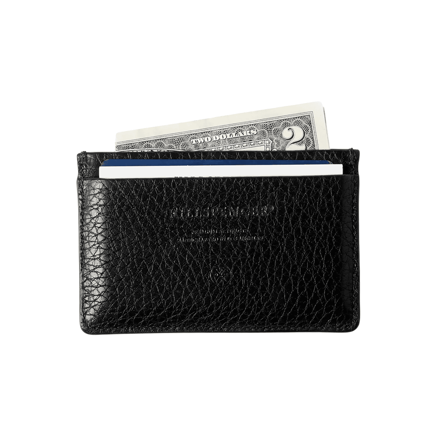Killspencer builds products in Los Angeles using full-grain leather and minimal hardware. The Card Holder 2.0 uses structured leather with a subtle pebbled texture that hides scratches better than smooth finishes. At 4 inches wide, it holds several cards in a slim frame that fits easily into front or back pockets without creating bulk.
