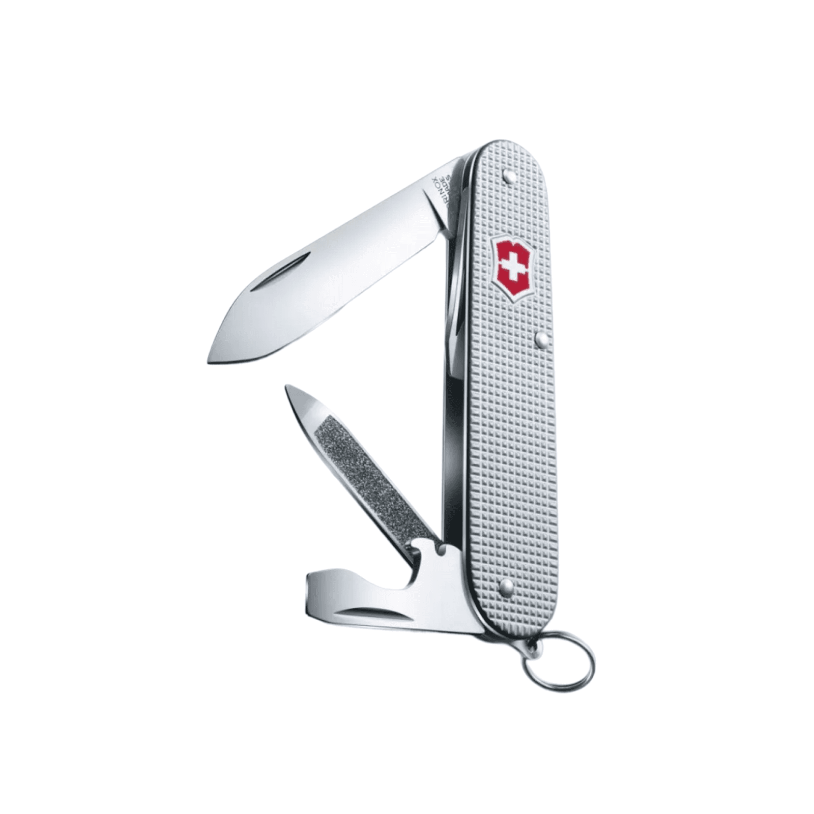 Nine tools fold inside: large blade, bottle opener, can opener, two screwdrivers, nail file, key ring. Nothing exotic. Nothing that requires explanation. Each folds with a satisfying, precise click that communicates quality more clearly than any spec sheet. The cross-and-shield emblem is pressed into the aluminum rather than painted, a detail so small it would be easy to miss and so right that you notice its absence on cheaper alternatives. The tolerances throughout are exact. Nothing wobbles. Nothing catches.